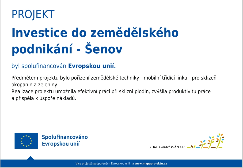 Jsme rodinná farma sídlící v Šenově u Nového Jičína. Naším hlavním zaměřením je produkce a následný prodej zeleniny. Pěstujeme brambory, česnek a cibuli. Následně chováme masný skot a prasata a samozřejmě nějakou drůbež. (Co je farma bez slepic?)